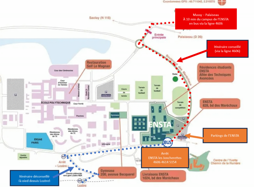- Rejoindre Massy – Palaiseau (RER B et C, ligne V, T 12, TGV) puis prendre la ligne 4606 jusqu’à l’arrêt ENSTA les joncherettes